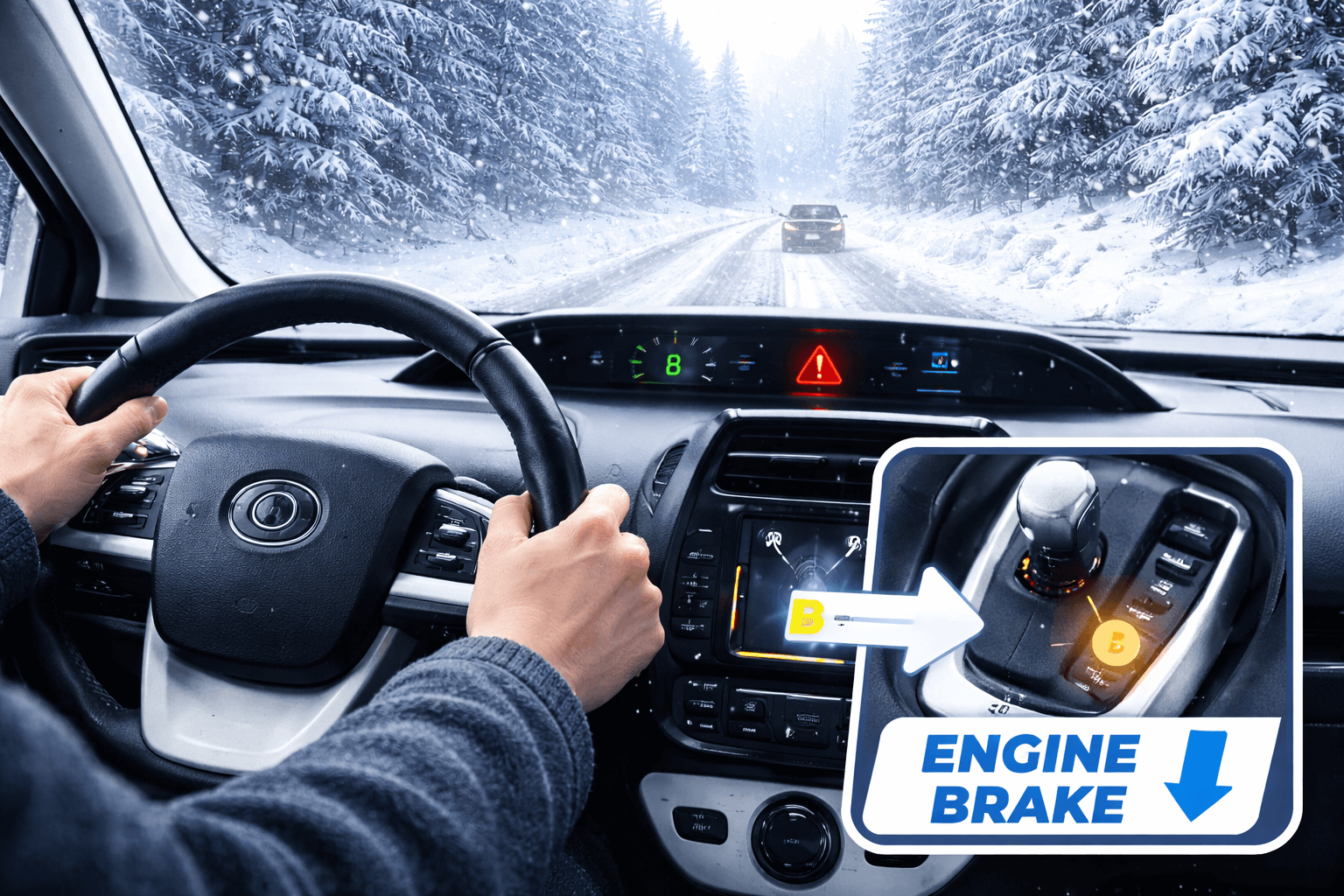 雪道を走るときは、タイヤのグリップが弱まり、通常のフットブレーキだけでは減速や停止が不安定になりがちです。